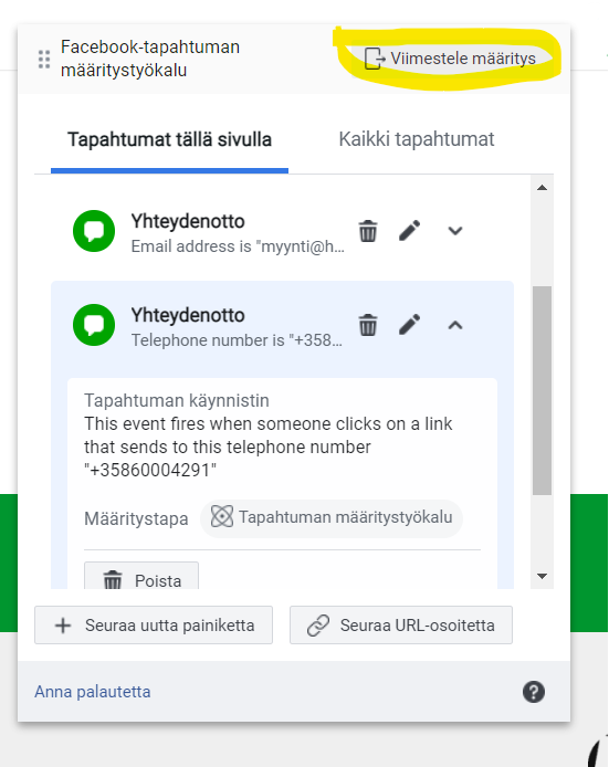 5. Voit valita samalla kertaa useita tapahtumia eri sivuilta. Kun olet valinnut kaikki haluamasi tapahtumat, klikkaa Tapahtuman määritystyökalun valintaikkunasta “Viimeistele määritys”. Vasta vahvistuksen jälkeen tapahtumat tallentuvat Metaan.